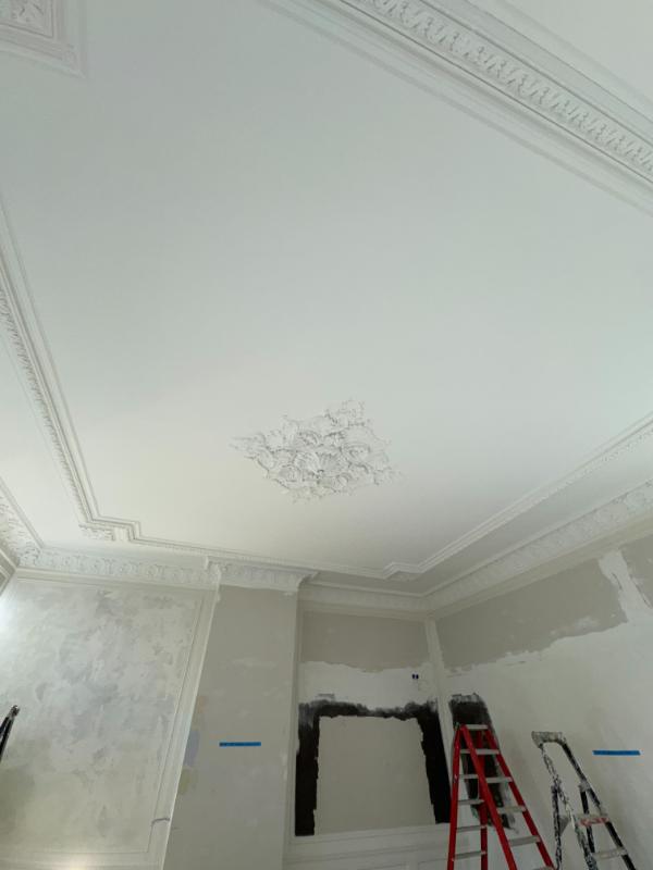 Belangrijke aandachtspunten voor herstel van het ornamentenplafond waren: Muur voorzichtig wegslopen om geen extra schade te maken. Plafond ondersteunen, extra zekeren om schade door de verbouwing te voorkomen. Rozet handmatig modelleren en herstellen. En de overige restauratie werkzaamheden: plafond vastzetten en details nalopen. Hieronder is een gedeelte van het proces in beeld gebracht en natuurlijk ook het eindresultaat: Een prachtige kamer met een fraai ornamentenplafond, met nog een hele lange toekomst voor zich.