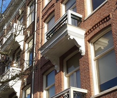 Balkon, voorzien van balkon ornamenten, in de Plantage buurt, nabij Artis.